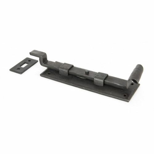A 'Fishtail' bolt which has been hand crafted to give a fine detail to the curl and forged with a unique spring mechanism to allow use in the vertical or horizontal positions. Designed to be used on outward opening doors (see straight version for inward opening). Supplied with matching receiver plate and fixing screws.