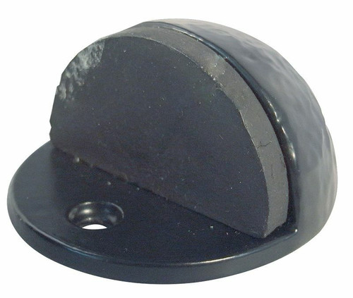 A cast iron, black antique finished door stop with black rubber buffer.