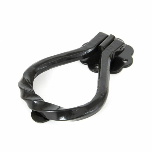 This elegant pear shaped door knocker shows a true masterpiece of forging and has been drawn from one piece of mild steel bar bent to form the a twisted pear shape and shows every hammer blow by our highly skilled blacksmiths. This is suitable for external use. It comes complete with a handmade stud or striker and all the fixing screws.