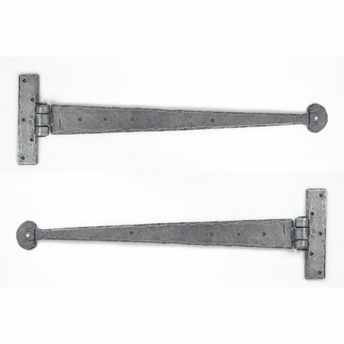 These T Hinges have a 'penny shaped' round end and is one of our most popular choices for hanging ledged and braced/plank doors. They are hot forged i.e. drawn to shape, not welded or fabricated and with the knuckle being fashioned in the traditional way it makes for a very strong product. The traditional way of choosing a hinge size means it should reach two thirds of the way across the door but providing it reaches at least half way across it should carry the weight of most doors with no problems. For especially heavy doors a third hinge can be used (three on one door) and these size hinges are suitable for a 2ft 6" or 2ft 9" door. Sold as a set and supplied with necessary fixing screws. Suitable for use internally or externally. Maintenance instructions must be followed to preserve the finish of your product. Finished in Pewter - for more information see the finishes guide here.