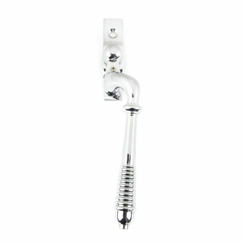 A narrow style window espag. handle with stylish reeded end detail. Fits on any type of window, including uPVC and timber due to its slim fixing plate. The handle is cranked away from the frame and window to allow ease of use. Made from solid brass and finished with polished Chrome which achieves a contemporary take on a traditional handle, simple but a real classic. It will tarnish in time as part of the ageing process but can be polished time and time again if you want to achieve a more perfect finish. It can be fitted to any modern espagnolette system and can be locked with a grub screw on the handle. Sold complete with a 7mm thick spindle and supplied with necessary fixing screws. Finished in Polished Chrome - for more information see the finishes guide here.