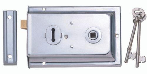 A polished chrome reversible rim lock complete with fixings.